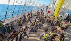 Di atas geladak KRI Bima Suci, prajurit KRI Bima Suci dan Taruna Akademi Angkatan Laut (AAL) Angkatan ke-72 melaksanakan Latihan Peran Layar, tepat saat melintasi Selat Makassar, Kamis (18/9/2025) hari ini dalam misi Latihan Praktik Kartika Jala Krida (Lattek KJK) tahun 2025. (Foto: Pen/2)