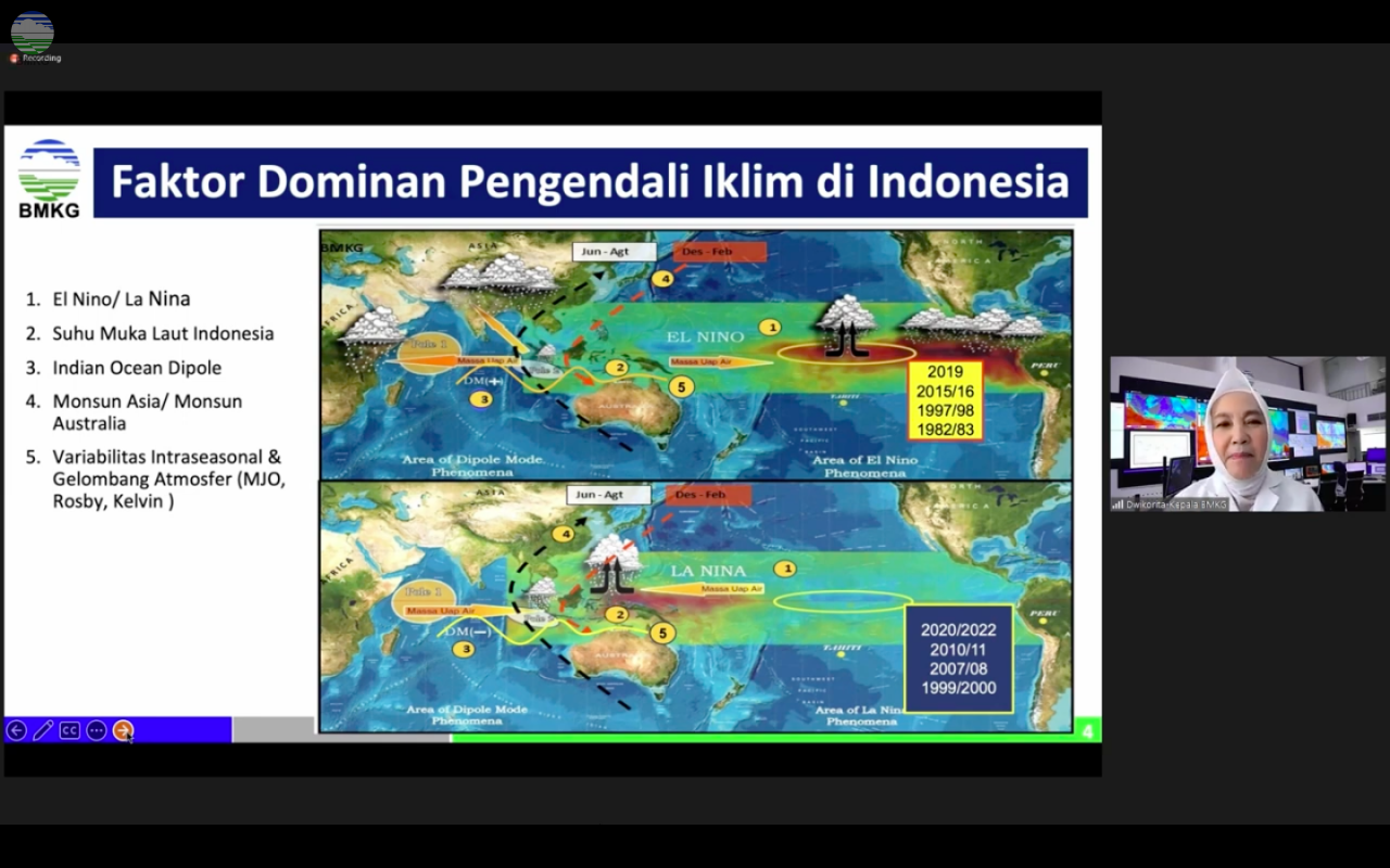 “Hingga Oktober dasarian II, 2023, El Nino moderate (+1.719) dan IOD positif (+2.014) masih bertahan. BMKG dan beberapa Pusat Iklim Dunia memprediksi El-Nino terus bertahan pada level moderat hingga periode Desember 2023-Januari-Februari 2024, sementara IOD Positif akan terus bertahan hingga akhir tahun 2023,” ungkap Dwikorita dalam rapat bersama Dewan Ketahanan Nasional (Wantannas) Republik Indonesia, baru-baru ini dalam siaran pers BMKG.