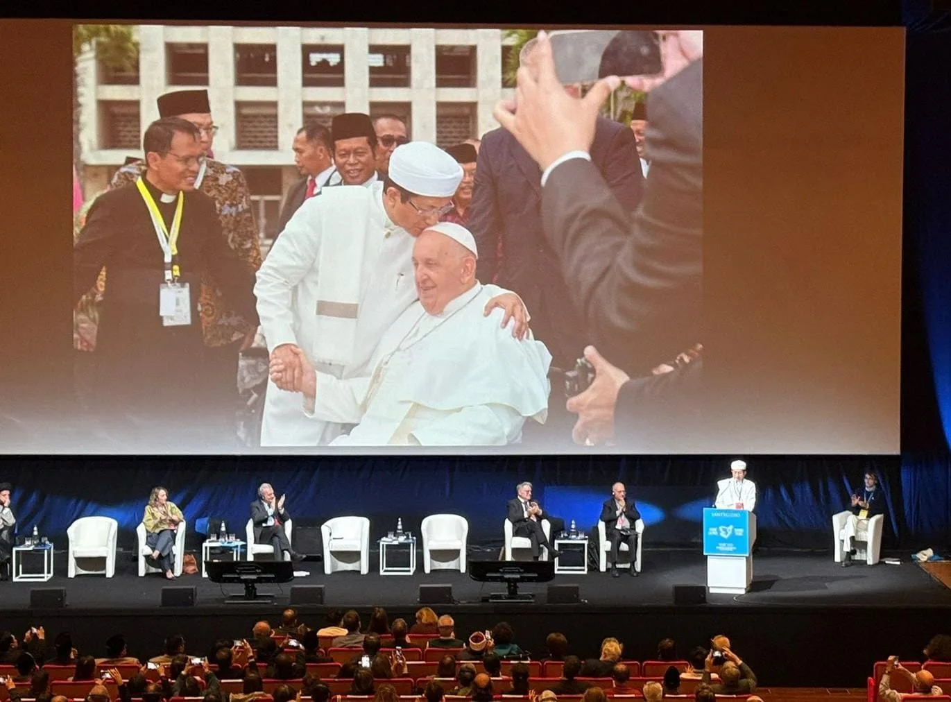 Bersamaan Menag Nasaruddin mengenang persahabatannya dengan Paus Fransiskus, terpampang di layar, dua foto bersejarah. Foto Imam Besar Masjid Istiqlal mencium kening Paus Fransiskus dan foto Paus Fransiskus mencium tangan Imam Besar Masjid Istiqlal.