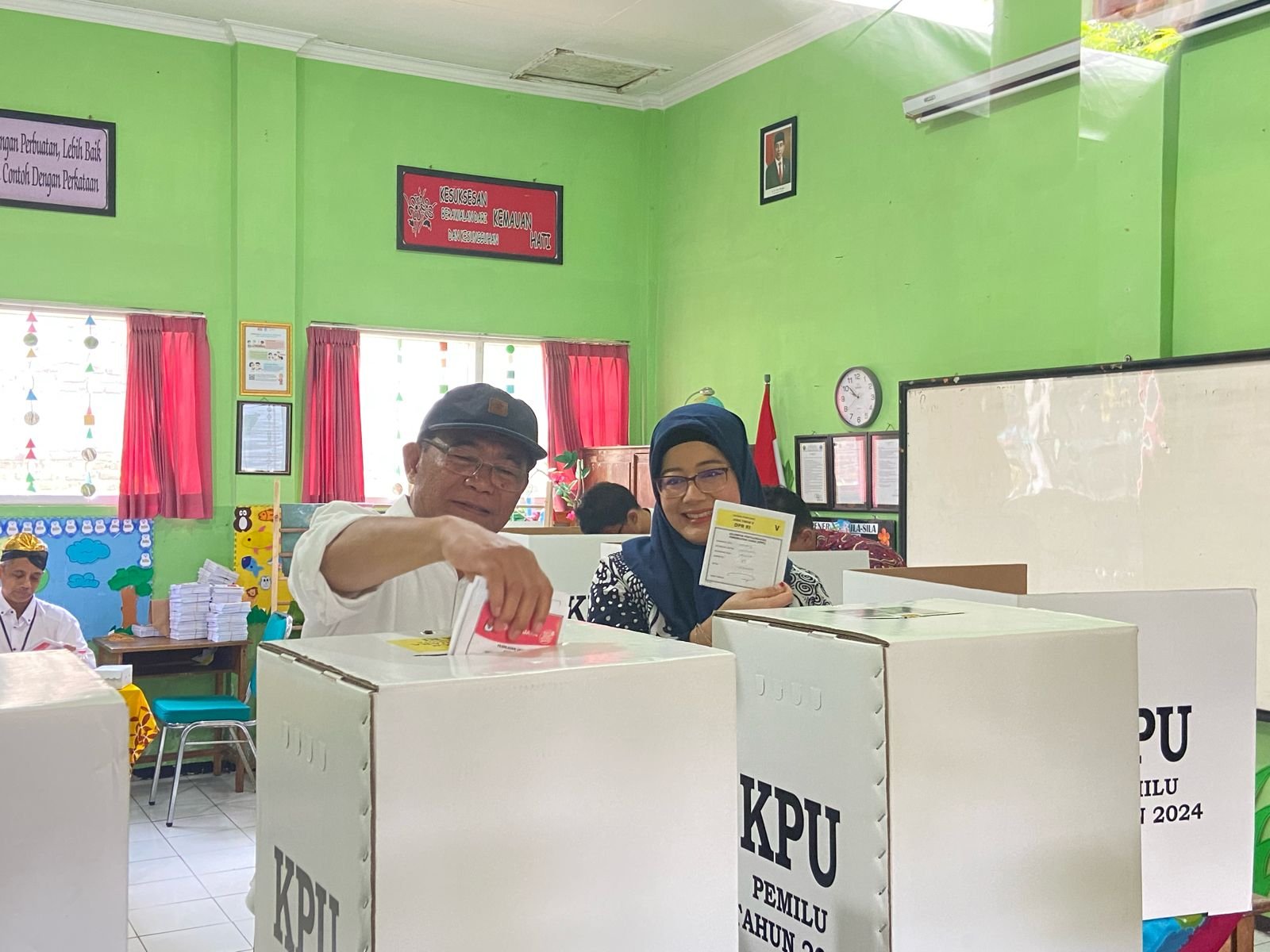 Muhadjir datang bersama istri dan dua anaknya yang merupakan pemilih pemula. Keempatnya terlebih dahulu menyapa warga sekitar yang juga turut mengantre menggunakan hak pilihnya.