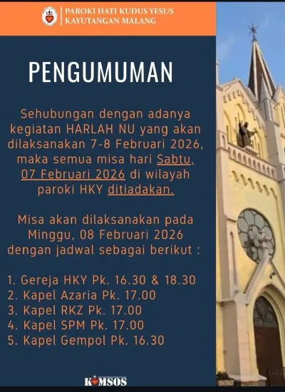 Dijelaskannya, misa bagi umat Katolik Paroki HKY Kayutangan akan dilaksanakan Minggu 8 Februari 2026. Dengan jadwal di Gereja HKY pada Pukul 16.30 dan 18.30 WIB.