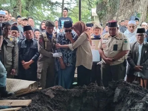 Dengan menggendong sang cucu, Wahyu nampak berusaha tegar mengantar sang istri menuju tempat peristirahat terakhir. Didampingi putrinya, Wahyu tak kuasa menahan tangis saat mengiringi jenazah sang istri ke liang lahat.