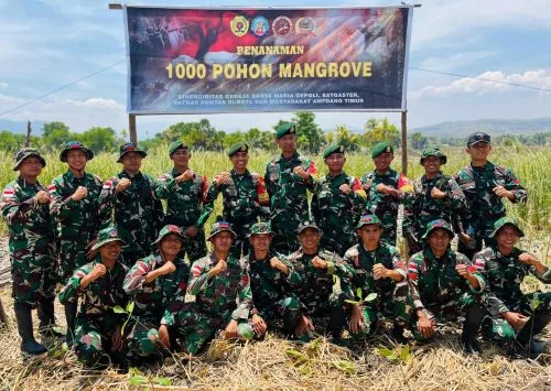 KUPANG- Personel Satgas Pamtas RI–RDTL Sektor Barat Yonarhanud 2 Kostrad yang bertugas di Pos Oepoli Sungai, Oepoli Tengah, dan Oepoli Pantai melaksanakan kegiatan Penanaman 1000 Pohon Mangrove di sepanjang pesisir Pantai Netemnanu Selatan, Kecamatan Amfoang Timur, Kabupaten Kupang. Senin (27/10/2025).