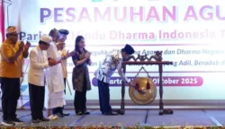 Menag Nasaruddin Umar saat menghadiri Pesamuhan Agung Tahun 2025 yang diselenggarakan oleh Parisada Hindu Dharma Indonesia (PHDI). (foto: