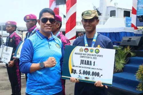Salah satu prajurit terbaik Koarmada II, Sertu Eko Dedi Kurniawan dari Dislambair Koarmada II, berhasil meraih Juara 1 Lomba Orientasi Bawah Air (OBA) pada ajang Makassar Navy Open Water Sport 2025 yang digelar di Dermaga Layang, Makassar. (Foto: Pen/2)