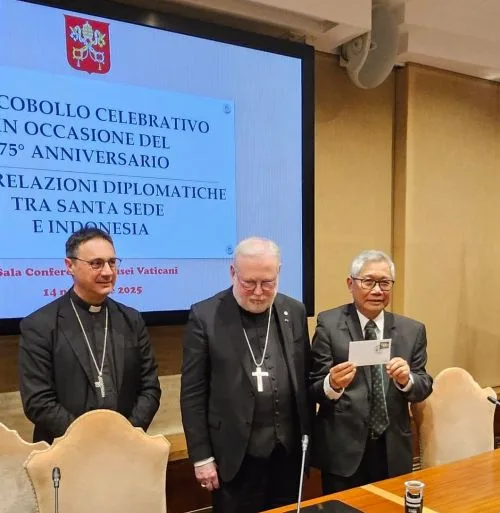 VATIKAN CITY- Secretary for Relations with States and International Organizations (Menlu) Mgr Paul Richard Gallagher dan Secretary General of the Governorate of Vatican City State Mgr Emilio Nappa, bersama Dubes RI untuk Takhta Suci Michael Trias Kuncahyono, meluncurkan perangko baru di Museum Vatikan, Jumat (14/11/2025). Perangko baru ini menjadi penanda ulang tahun ke-75 Hubungan Diplomatik Indonesia dan Takhta Suci.