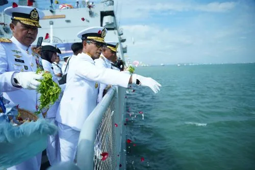 SURABAYAUpacara Tabur Bunga di Laut dalam rangka Peringatan Hari Dharma Samudera Tahun 2026 digelar secara khidmat di atas geladak KRI Brawijaya-320, unsur Satuan Kapal Eskorta Koarmada II, Kamis (15/1/2026) kemarin.