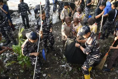 Menjelang peringatan Hari Pahlawan 10 November, prajurit KRI Badik-622 bersama personel Pangkalan TNI AL Balikpapan, Saka Bahari dan unsur maritim Balikpapan melaksanakan bersih-bersih di Pantai Melawai serta pembagian Sembako bagi masyarakat sekitar pantai Balikpapan. (Foto: Pen/2)