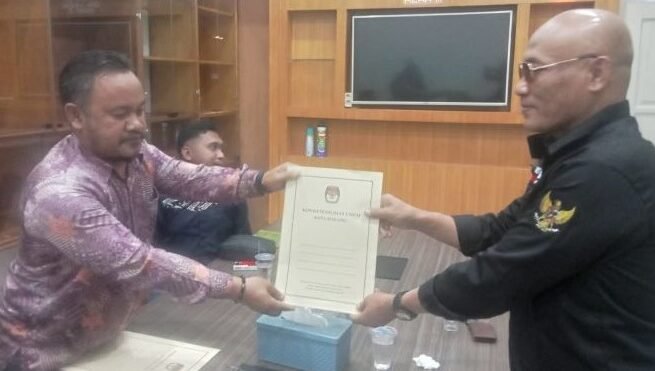 Tim Hukum Sam HC-Rizky Boncell memberikan berita acara putusan lolosnya tahap verifikasi administrasi syarat dukungan di KPU Kota Malang, Selasa (6/8/2024) lalu.
