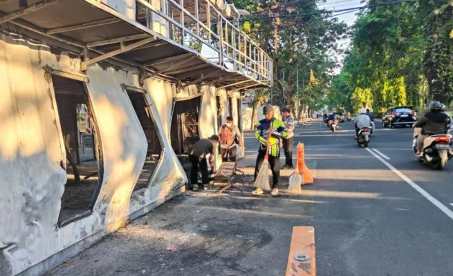Warga bersama driver ojol membersihkan pos polisi yang dibakar massa aksi unjuk rasa pada Jumat (29/8/2025) dini hari lalu. Mereka menyapu, mengepel, hingga membersihkan serpihan kaca di lokasi. Terdapat 3 pos penjagaan yang dibersihkan. Yakni Pos Lantas Bundaran A. Yani atau Taman Pelangi, Raya Darmo atau Taman Bungkul, dan Wonokromo atau sisi timur KBS. (Foto: humas.polri.go.id)