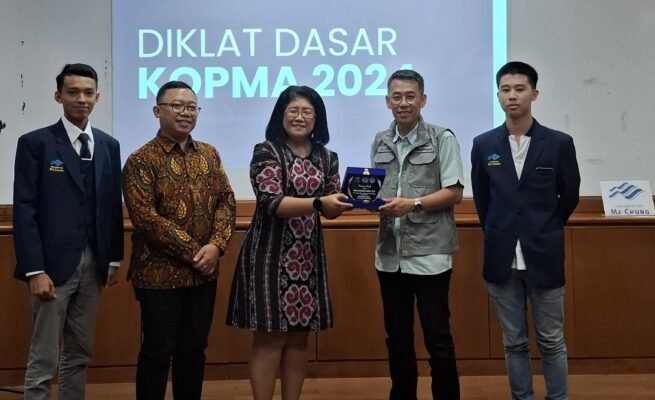 Pengurus Lembaga Kemahasiswaan Koperasi Mahasiswa Universitas Ma Chung, pendamping Koperasi Mahasiswa Universitas Ma Chung Janviera Adriana Nugrahani, SE, MM serta dua pemateri Felik Sad Windu Wisnu Broto, M.Hum dan Bagus Pambudi, S.Sos, M.Si di sela diklat, Sabtu (8/6/2024.