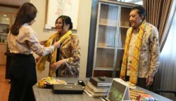 Proses serah terima selendang batik dari Batik Huza sebagai cendera mata CHANDI 2025 yang akan dilaksanakan September mendatang. (Foto: kemenbud.go.id).