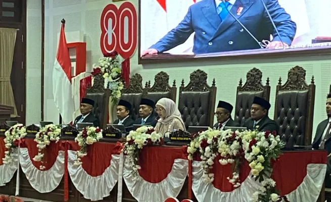 Ketua DPRD Kota Malang Amithya Ratnanggani Sirraduhita memimpin Rapat Paripurna DPRD Kota Malang dengan agenda Mendengarkan Sidang Tahunan MPR RI dan Pidato Kenegaraan Presiden Dalam Rangka HUT Ke 80 Kemerdekaan RI, Jumat (15/8/2025) hari ini.