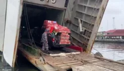 KRI Teluk Banten-516 menuntaskan proses debarkasi serta serah terima relawan dan bahan kontak di Dermaga Beachplate Krueng Geukueh, Lhokseumawe. (foto: Pen/2)