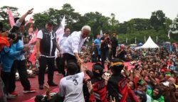 Calon Presiden No Urut 3 Ganjar Pranowo menyapa warga yang memadati lokasi kampanye di Lapangan Kedungkandang, Kota Malang Selasa (30/1/2024) sore tadi.
