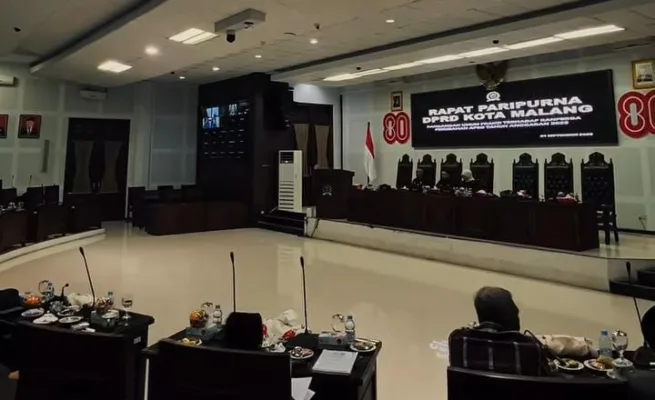 Rapat Paripurna Penyampaian Pandangan Umum Fraksi terhadap Rancangan Perubahan APBD Kota Malang Tahun 2025, Kamis (4/9/2025) hari ini di DPRD Kota Malang.