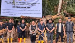 Tim Direktorat Tindak Pidana Tertentu (Dittipidter) Bareskrim Polri mengambil 27 sampel kayu di sepanjang Daerah Aliran Sungai (DAS) Garoga, Tapanuli Utara, Sumatera Utara. (Foto: humas.polri.go.id)