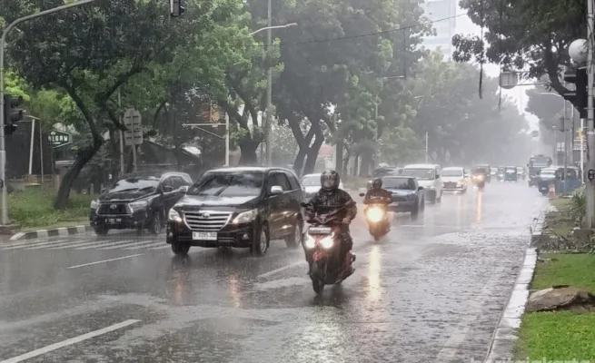 Pengendara motor melintas ketika hujan. (Foto: doc-beritajakarta.id)