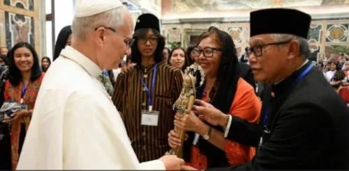 Pimpinan atau pengurus organisasi pemuda lintas iman yakni GP Ansor, Pemuda Muhammadiyah, Pemuda Katolik (PK), Gerakan Angkatan Muda Kristen Indonesia (GAMKI), Persatuan Pemuda Hindu Indonesia (Peradah), Buddha (Gemabudhi), dan Konghucu (Gemaku) foto bersama Dubes Vatikan untuk Indonesia Mgr Piero Pioppo dan Penasihat Paguyuban Wartawan Katolik Indonesia (PWKI) AM Putut Prabantoro. (Foto: PWKI)