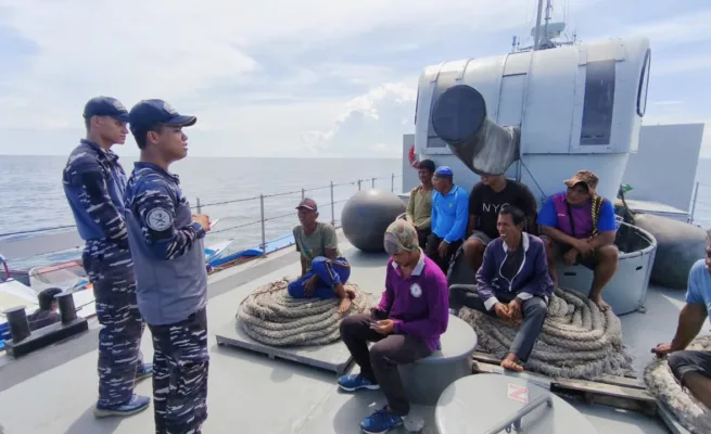 Prajurit KRI Hiu-634 dari Satkat (Satuan Kapal Cepat) Koarmada II, melaksanakan sosialisasi pentingnya membawa dan melengkapi dokumen diri kepada masyarakat pesisir khususnya nelayan di perairan Karang Unarang, Senin (20/10/2025) hari ini. (Foto: Pen/2)