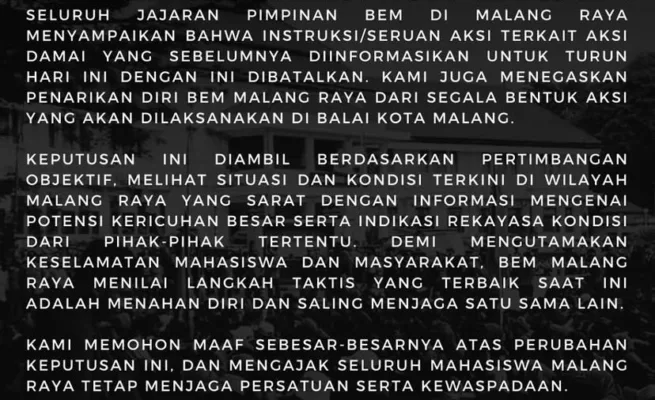 Demi Keselamatan Mahasiswa dan Rakyat, BEM Malang Raya Batalkan Unjuk Rasa Senin 1 September