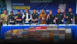 Wali Kota Malang Wahyu Hidayat, para pejabat Pemkot Malang dan Bea Cukai Malang hadir dalam pemusnahan lebih dari 2,6 juta batang rokok ilegal serta 23 botol (13,8 liter) minuman beralkohol ilegal di TPA Supit Urang, Selasa (9/12/2025) hari ini. (Foto: Diskominfo Kota Malang).