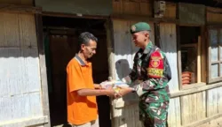 Personel Makosatgas Pamtas RI-RDTL Sektor Barat Yonarhanud 2 Kostrad mengadakan kegiatan Jumat Berkah berupa pembagian bantuan sembako bagi masyarakat yang membutuhkan di sekitar Makosatgas Eban, Kecamatan Miomaffo Barat, Kabupaten TTU, NTT, Jumat (7/11/2025) kemarin. (Foto: Pen Yonarhanud 2 Kostrad)