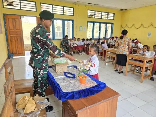 Tumbuhkan Semangat Kepahlawanan, Satgas Pamtas Yonarhanud 2 Kostrad Menjadi Tenaga Pendidik dan Bagikan Buku Rohani di Sekolah Perbatasan